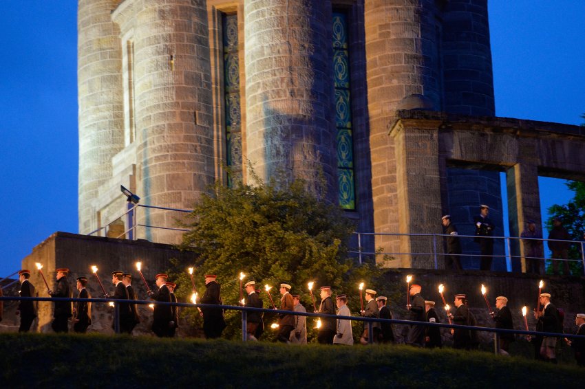 Freitagabend in Eisenach: Etwa 400 Korporierte stampfen schweigend mit Fackeln in den Händen zu einem etwa 30 Meter hohen Turm mit Blick auf die Wartburg, der sich düster über die Stadt erhebt.